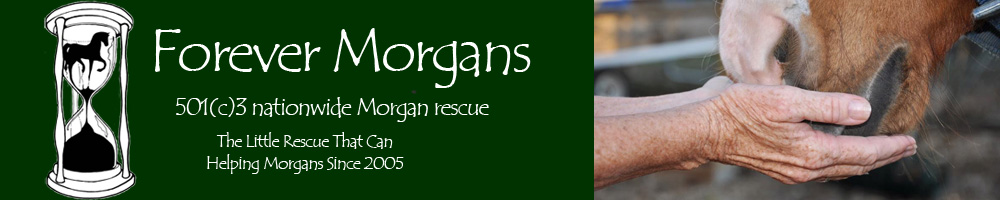 Click here for Latest Information on Morgan Herds at Risk Forever Morgans Rescue, Inc. is an all-volunteer, non-profit 501(c)3 rescue organization that strives to help Morgan horses in immediate need and places them in adoptive or foster homes. Horses come from broker lots, auctions, neglect and abuse situations, and owner surrender. We always need foster and adoptive homes, donations, and volunteers. Please join us! All donations to Forever Morgans are tax deductible as allowed by law. Each horse is adopted with a contract to ensure they do not end up at auction again. Many of these rescued Morgans have gone on to be show horses, family riding and driving horses and for therapeutic handicap riding. Please consider fostering or adopting. The horses are not truly safe until they are home!