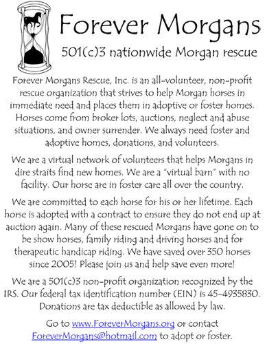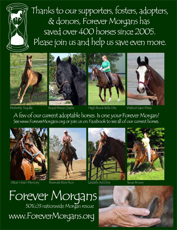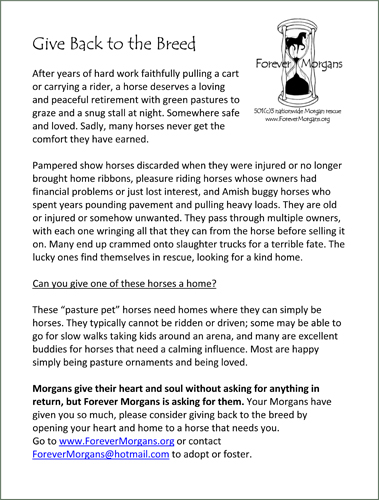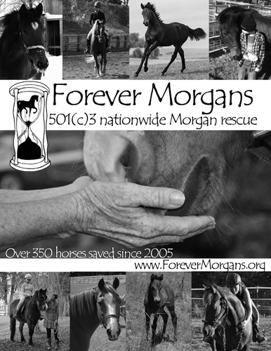 EducatePampered show horses discarded when they no longer brought home ribbons, pleasure riding horses whose owners had financial problems or lost interest, and Amish buggy horses who spent years pounding pavement and pulling heavy loads. They are unwanted, possibly old or injured. They may pass through multiple owners, each one wringing all that they can from the horse before selling it on. Many end up crammed onto slaughter trucks for a terrible fate. Forever Morgans is working to reach horses before they start this downward spiral.When we contact the former owners of rescued horses, they often say they didn't know of options other than sending the horse to auction or selling it cheaply to a broker. They are thrilled that Forever Morgans exists and relieved that the horse is safe. Many have contacted us to help find homes for subsequent horses. Educating people that there are other options saves lives!
