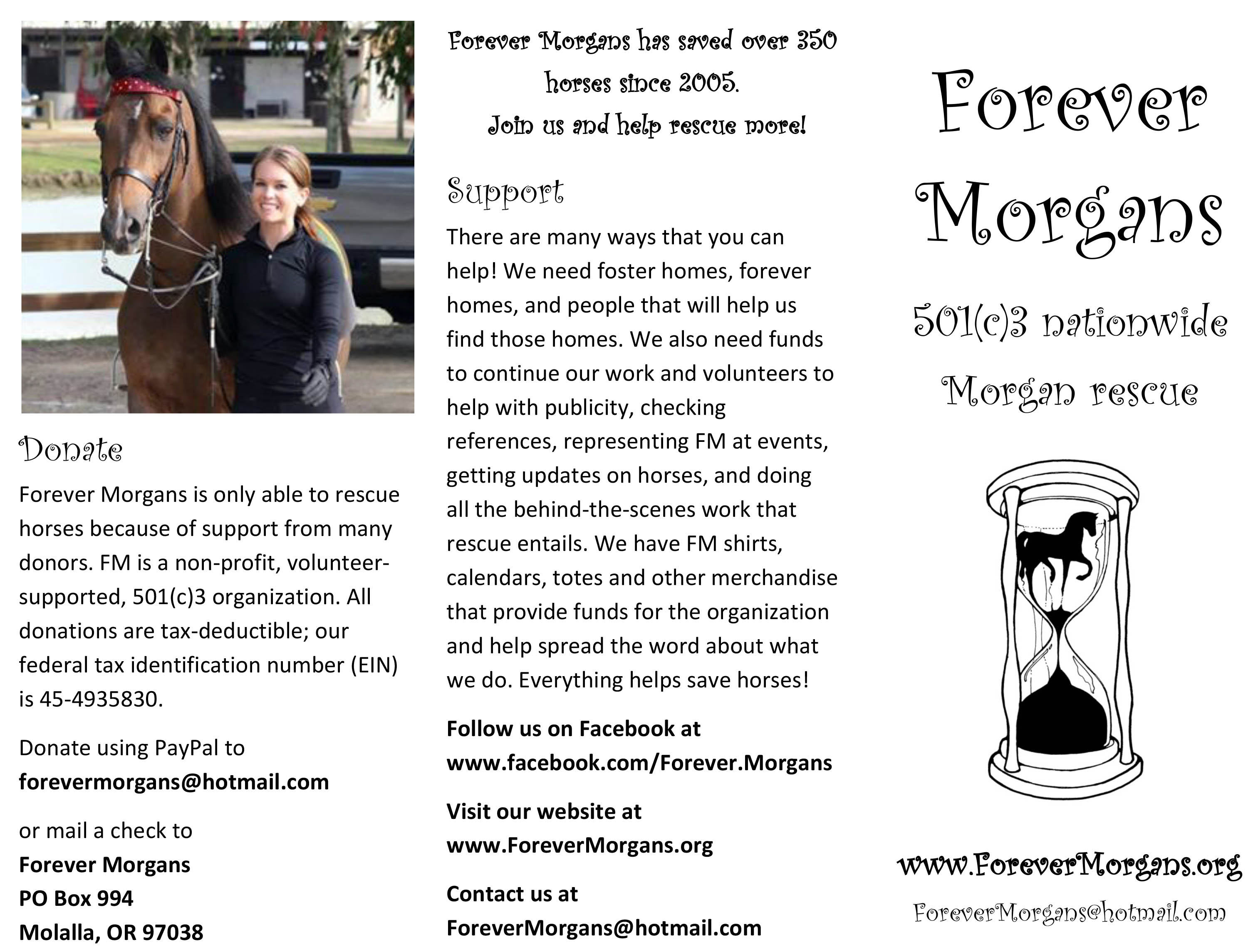 Spread The Word!Are you going to a horse show or event? Part of a club or youth group? Would you like to help spread the word about Forever Morgans? Please consider helping at an informational booth or posting flyers. It can be as simple as printing and posting a few flyers about FM and available horses, or you can go all-out and have a booth with banners, merchandise, and a presentation about FM horses. FM especially needs people who are willing to take an FM foster or adopted horse as an example of the horses we save. You could be the one who helps a horse find its forever home!